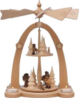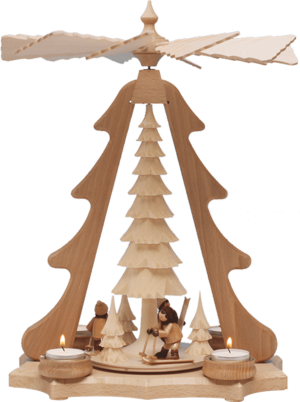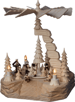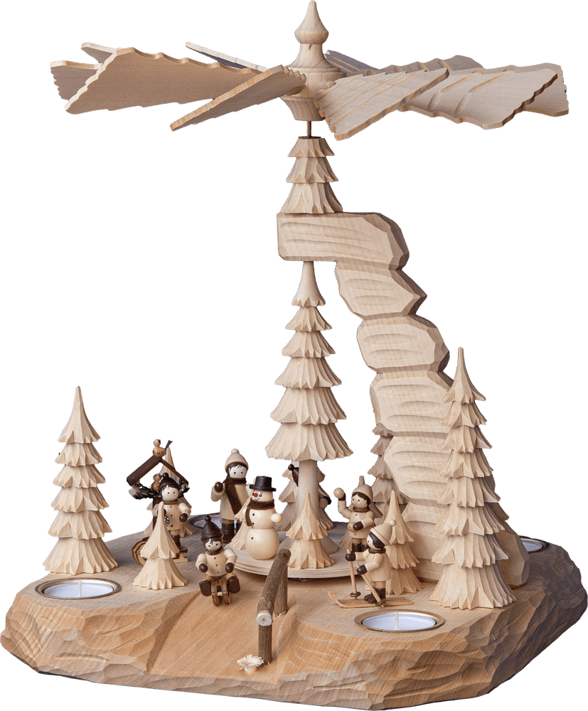 bestückt mit Winterkindern und geschnitzten Bäumen