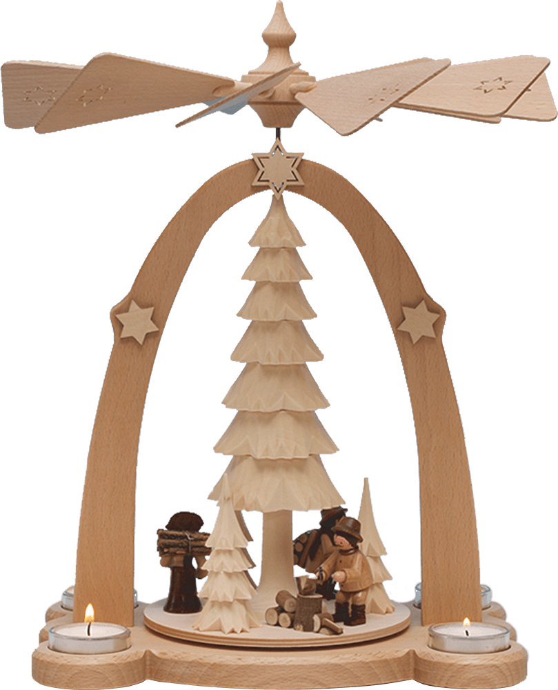 Pyramide bestückt mit 3 Waldfiguren und 3 geschnitzten Bäumen