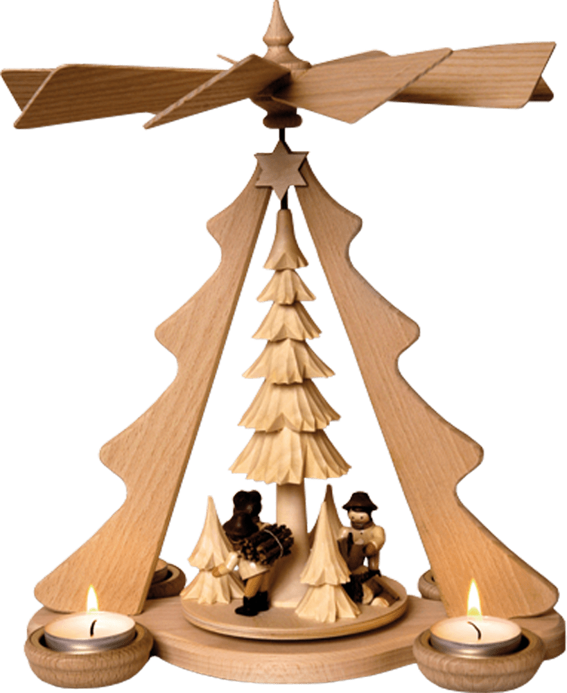 Pyramide bestückt mit 3 Waldleuten und 3 geschnitzen Bäumen