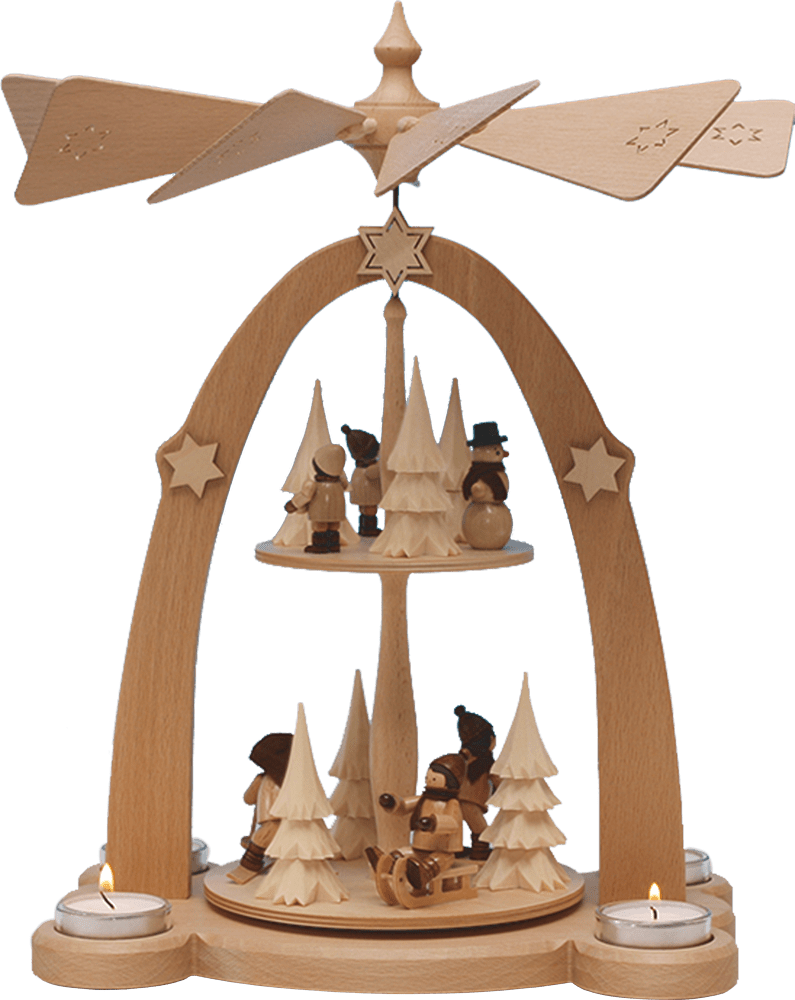 Pyramide bestückt mit 6 Winterkinder und 6 geschnitzten Bäumen, 2-stöckig