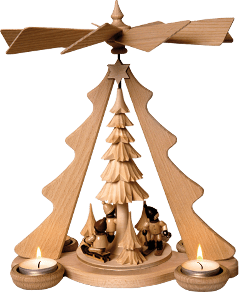 Pyramide bestückt mit 3 Winterkinder und 3 geschnitzen Bäumen