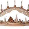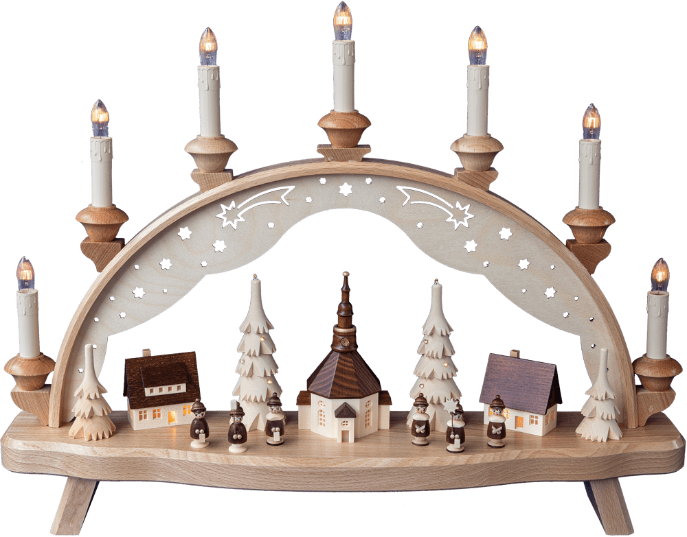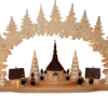 Schwibbogen Seiffener Kirche mit 2 beleuchteten Bäumen und innenbel. Häuser